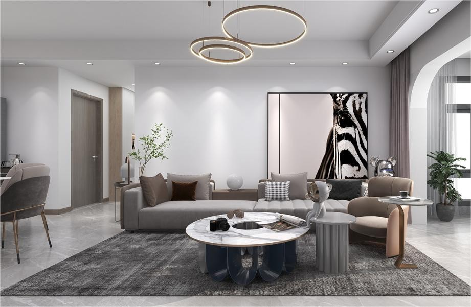 此户型为114平,现代风格,整体是精白颜色为底色,灰添彩空间的***