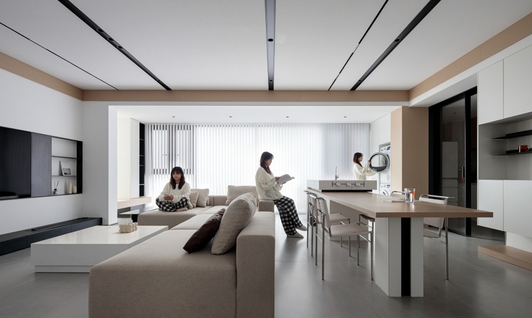 利落的框架结构在同一条轴线上展开,局部刻意进行切割赋予造型,营造出动线灵活、视觉开阔的家居环境。