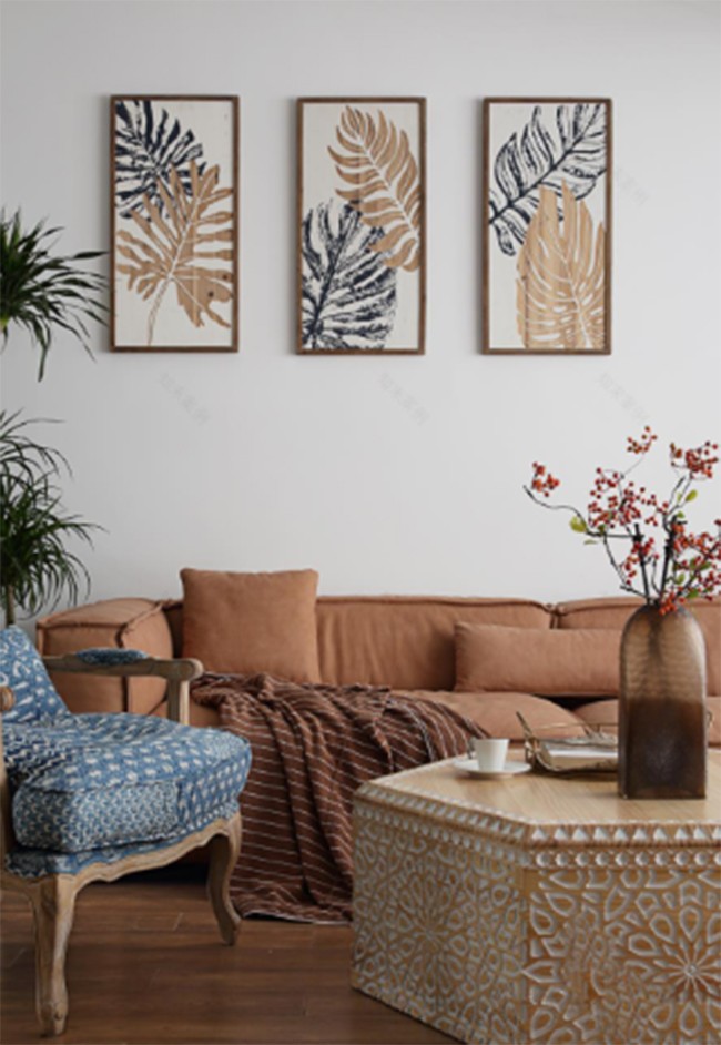 空间格局上牺牲了一房一卫,将客厅、餐厅、厨房融为一个大整体,在功能上进行区分的同时又完全都是开放式,采光上做到了极大的放大。客厅木地板,棕橘色的双人沙发搭配木制雕花的茶几,布局简约又不失格调,扎染的蓝色单椅也让空间多了几分浓浓的怀旧氛围。吊顶采用无主灯的设计,轨道灯、射灯和感应灯带的组合,让你见光不见灯,满足基本的照明和情感氛围,避免视觉焦点带来的沉重感。