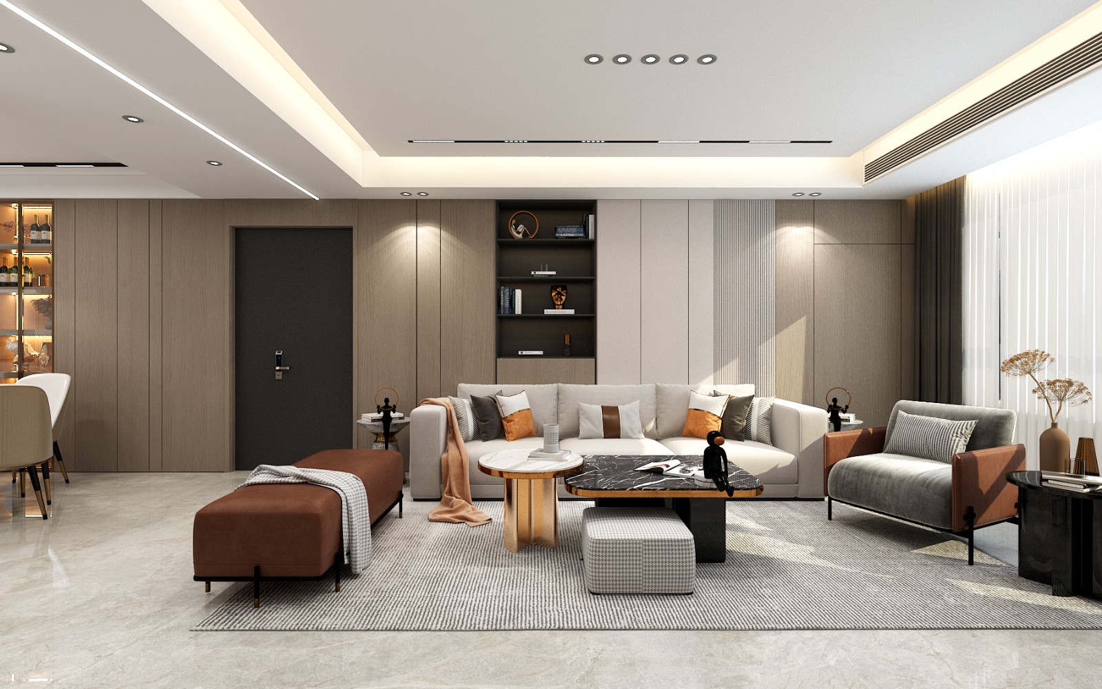 大平顶的无主灯悬浮吊顶设计,让客厅空间更显大气,大理石+木饰面+木格栅整体简洁大方有质感。