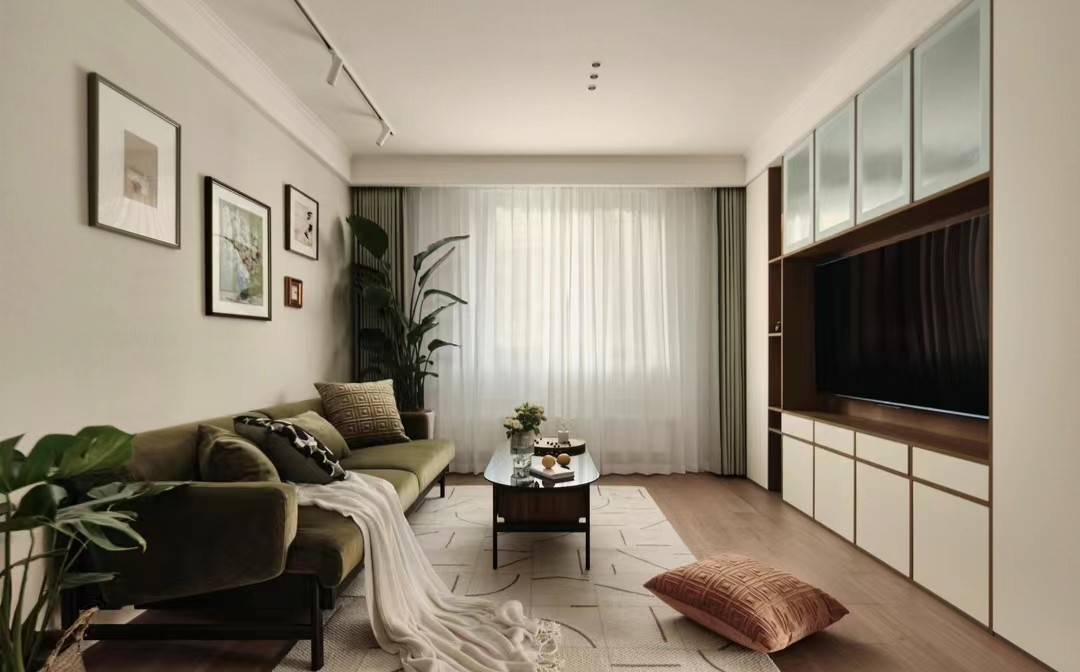 客厅整体突出全屋轻法式复古气质,采用奶油白为主调,多处采用深色系串联空间,强调视觉重心,区别于大众化的奶油法式,彰显整体的典雅高贵感