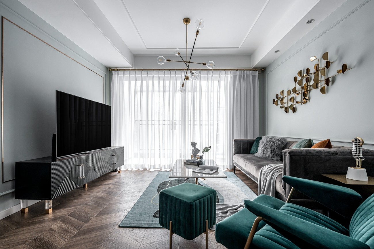 交错的设计感主灯的使用丰富了客厅的层次感,半透明窗纱让阳光能够更好的穿透到室内,使空间明亮通透,少量而精致的金属元素很好的呼应了整个空间的轻奢质感,墙面去奢从简,运用大量纤细的石膏线条来进行空间的区域划分。