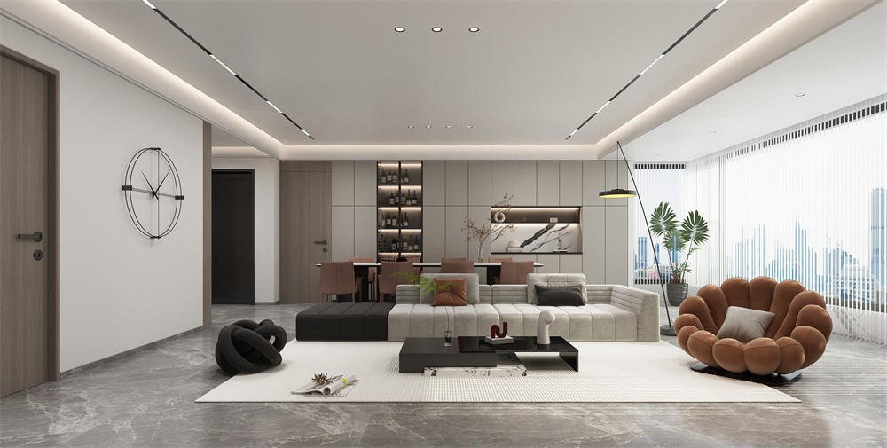 客厅以灰、白为主调,褐色做点睛之笔, 颜色散开空间有序的层级,精致的软装浓缩着空间意想不到功能, 光影的落笔与空间材质撞个满怀,空间慵懒静谧的氛围纷至沓来。