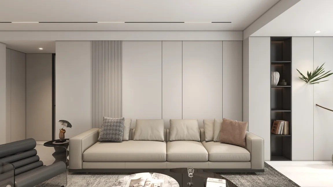 现代风格是注重人与自然、环境的相结合,集中体现了绿色设计、环保设计、可持续发展设计的理念;一点绿色自然的元素更能衬托出其风格特点;电视墙以及电视地柜采用悬空、延伸、穿插的设计手法将书房、客厅、阳台三个空间联动起来,既增加空间美感又能增强生活趣味性。