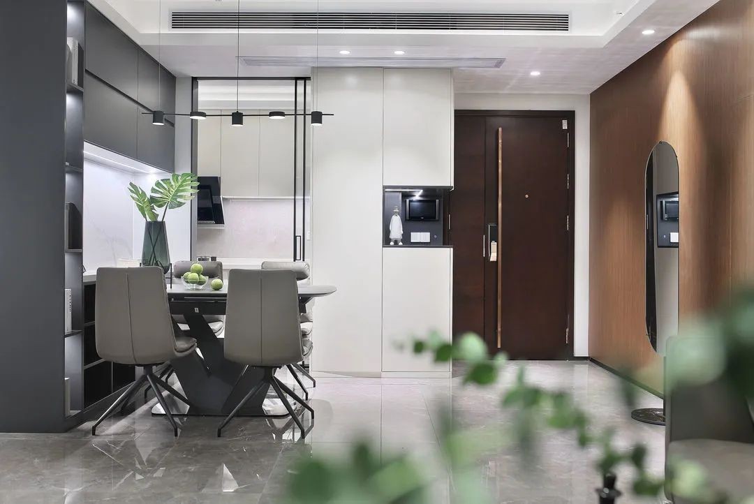 餐厨采用黑色细边框玻璃门隔断,弱化了视觉厚重感,更加简约通透大气。