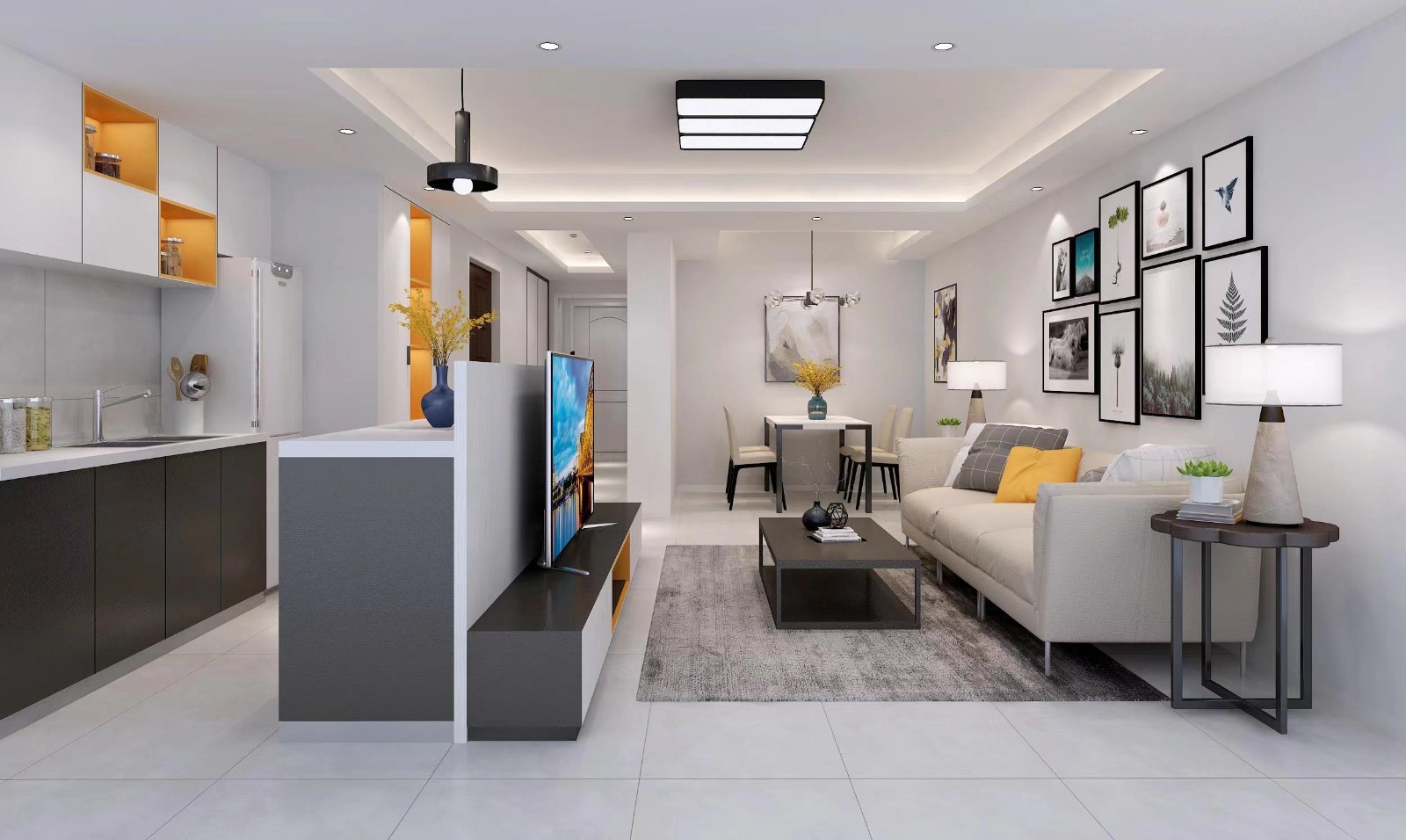 这是一家三口的小屋,所以设计师在客厅打造的空间更宽敞一些,半开放式的厨房,让空间在视觉上增加了空间。