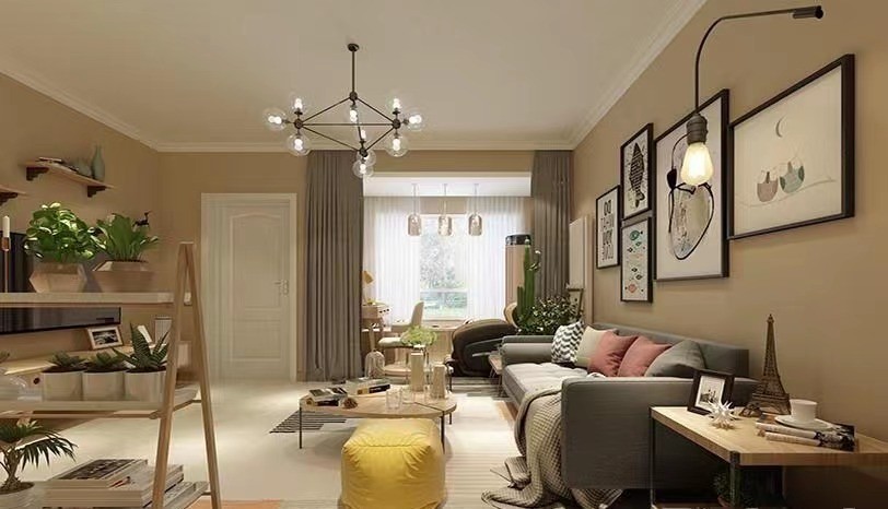 客厅整体风格比较温馨,米棕色的墙搭上灰色沙发很***,再加上桌子家具显得温馨中带着一些二慵懒,加上有黄色的懒人椅,,点亮整个空间