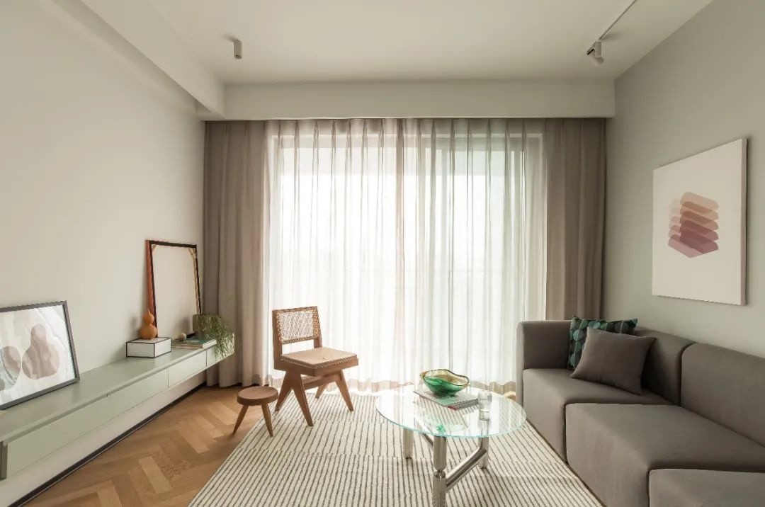 客餐厅空间采用杏灰色与豆蔻青作为空间的基调,加上屋主喜好的温润的橡木色“人字铺”地板点缀。