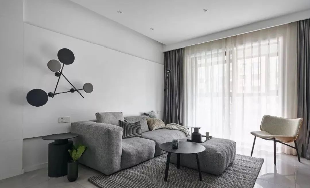 客厅空间,灰色石纹地砖铺就,搭配留白墙顶面,通透的落地窗满足室内采光,深灰色布艺沙发,地毯,黑色茶等搭配,与白色形成对比,呈现出都市生活的简练感。