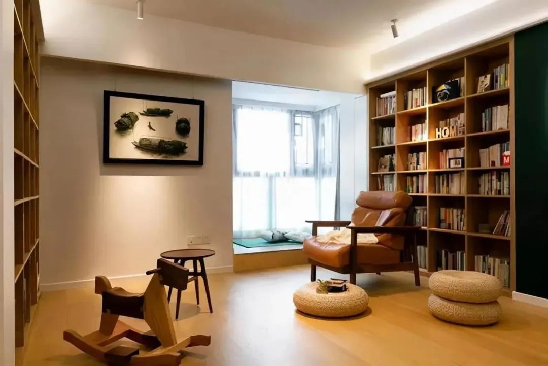 床的两侧安装了对称的吊灯,晚上在卧室看电影时,打开吊灯更显大气。嵌入式衣柜设计在主卧入口区域,设计师特意在凸窗附近留出一排开放式橱柜,可作为书架使用