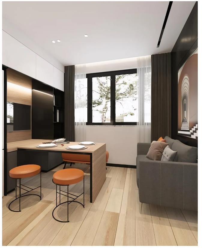 业主一家三口居住,经过设计师巧妙合理的利用空间,不仅有两个卧室、卫生间还做了干湿分离,还有充足的收纳空间。