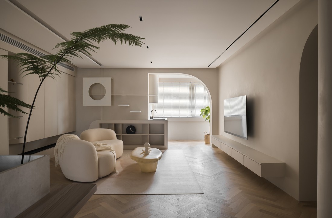 空间整体以素雅安静的低饱和色为主,选择奶油色系,让空间在清简宁静的同时,也有家的温馨和温度。客厅的布局也遵循自然简约的原则,平面吊顶、无主灯设计、同色系的软装,让空间视觉趋于一体,更为融洽,与阳台之间的门洞采用弧形线条勾画,结合空间的奶油色调,更加温柔流畅