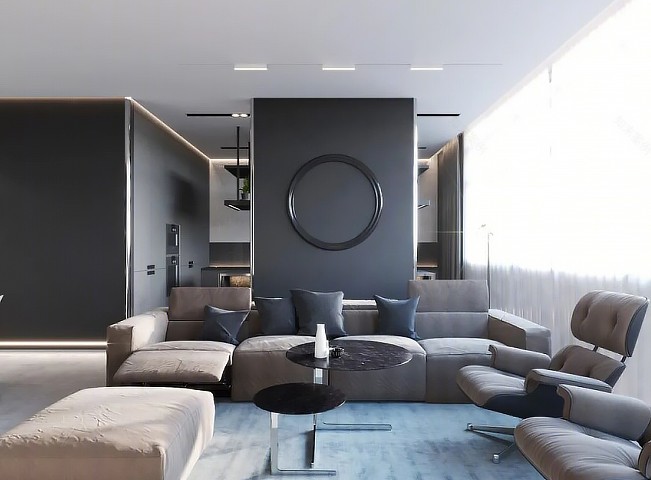 用一面墙半隔开,灰色的沙发,整个空间较暗,大大的窗户,充足的光线和温和的气息映入眼帘。