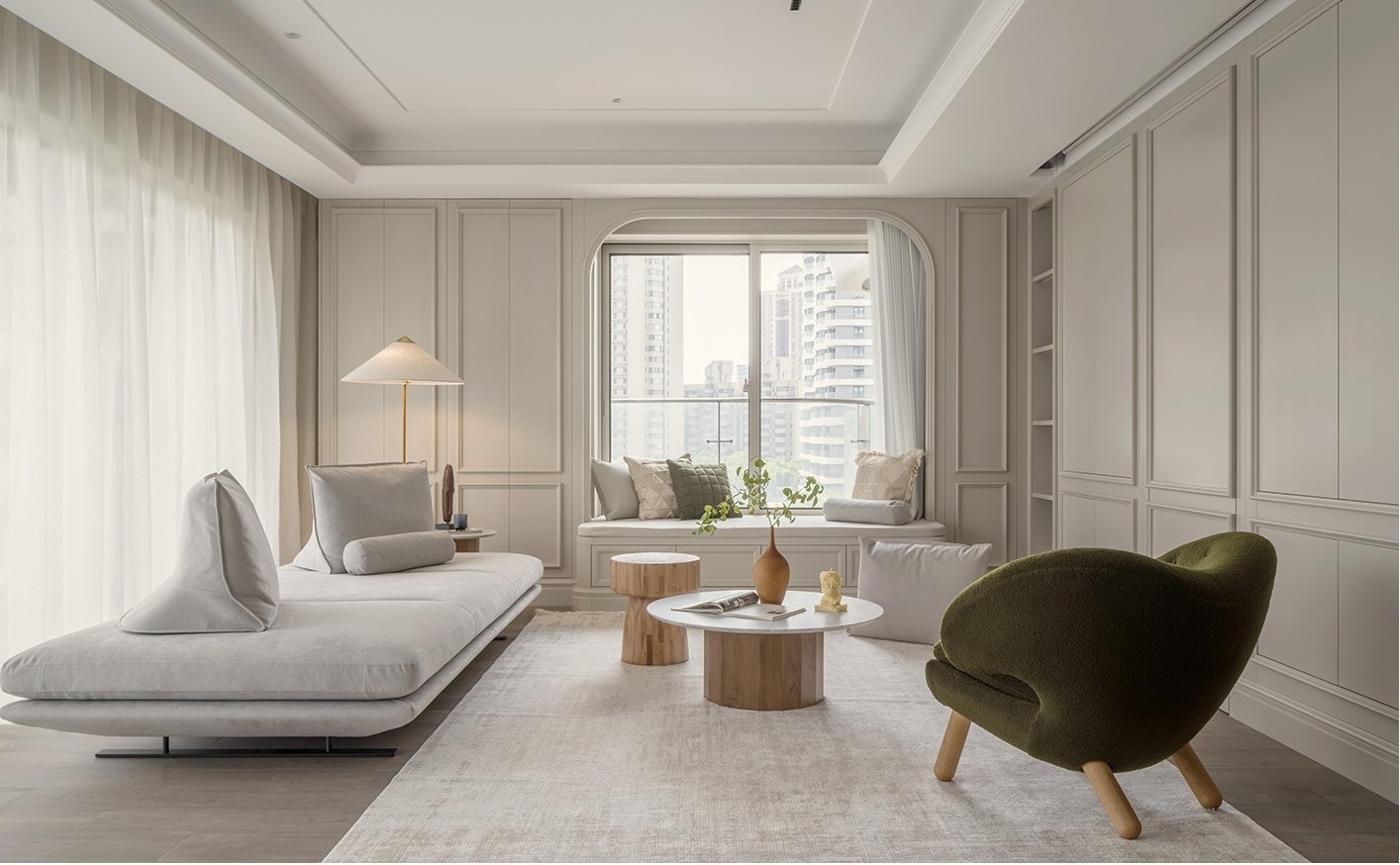 以藏为美的设计手法,满足女屋主的强收纳需求。客餐厅可见的墙面均做了隐藏式收纳柜。