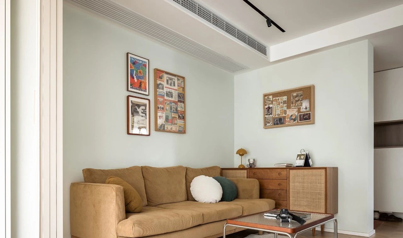 浅咖色沙发搭配复古茶几,浅绿色背景点缀潮流装饰画,艺术与生活在此体现