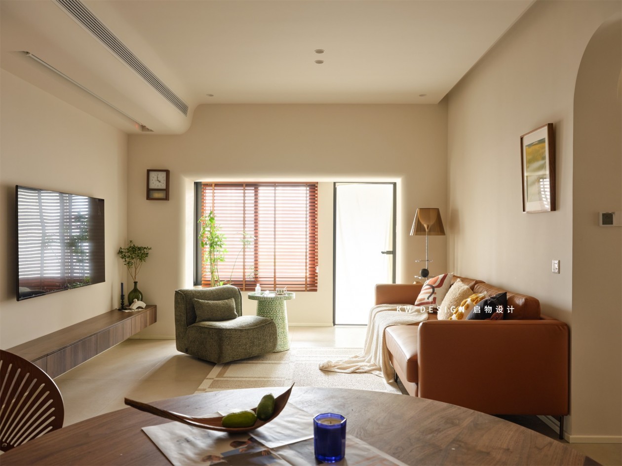 拓者案例分享:空间上结合小婉子对风格色彩的偏好,弧形结构搭配奶油色作温柔耐看的硬装基底,古着木色与清新调色色融于其中,平衡现代北欧与复古,打造自然朴实且轻松的中性空间氛围