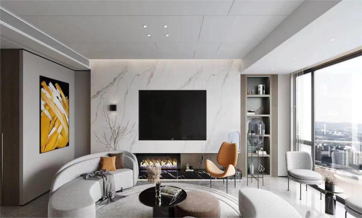 客厅在创造温馨自由的家庭气氛,同时也需适用业主日常生活的种种功能米白色沙发点色,在对立统一创造出自然的和谐