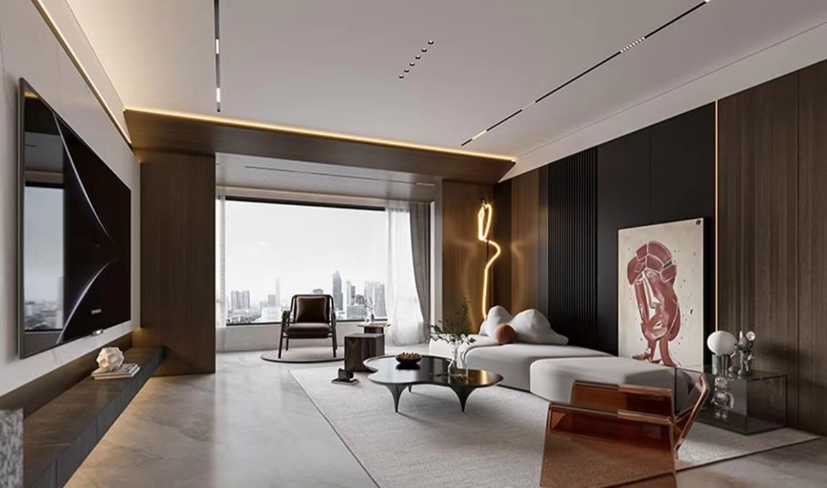 客厅采用现代极简家具,是重与轻的结合,装饰现代抽象画像丰富