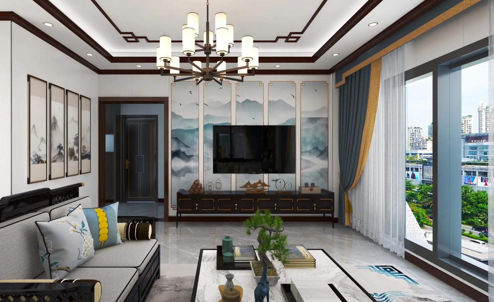 客厅中设有中式风格明显的吊灯,更凸显氛围。