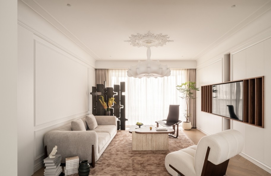 空间整体以纯白为主色调,于静雅的纯色背景墙装饰PU线条,以清简线条实现法式经典元素的塑造,将法式的雅致与现下屋主所需的简单糅合为一,收获内敛清爽又不失气质的居家环境。