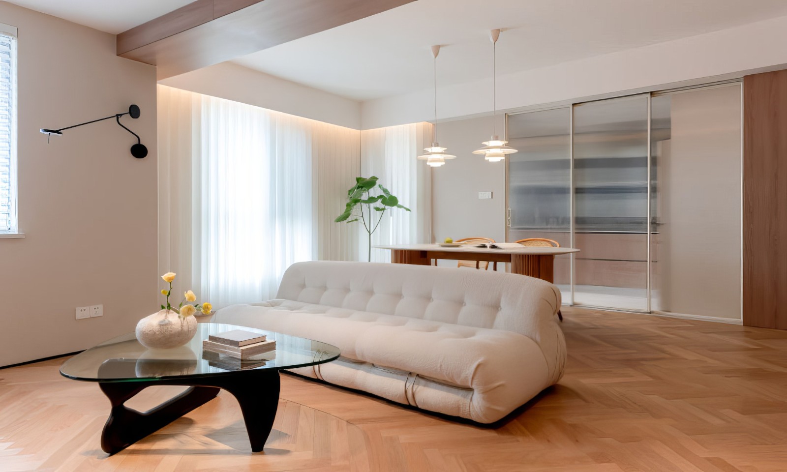 考虑日常只有父母住,对这个户型进行大胆的改造,由原来的两室改为现在的大横厅,让客厅和餐厅融在一起,形成大横厅的空间,客餐厅一体化设计增加空间感的同时又满足家人互动交流,让空间成为一种家庭情感的记忆。材质选择上使用了较为柔软亲和的原木,与不同肌理的白色相互配合,营造温暖舒适的氛围。空间中的动线被一再简化,回归最原始的生活。