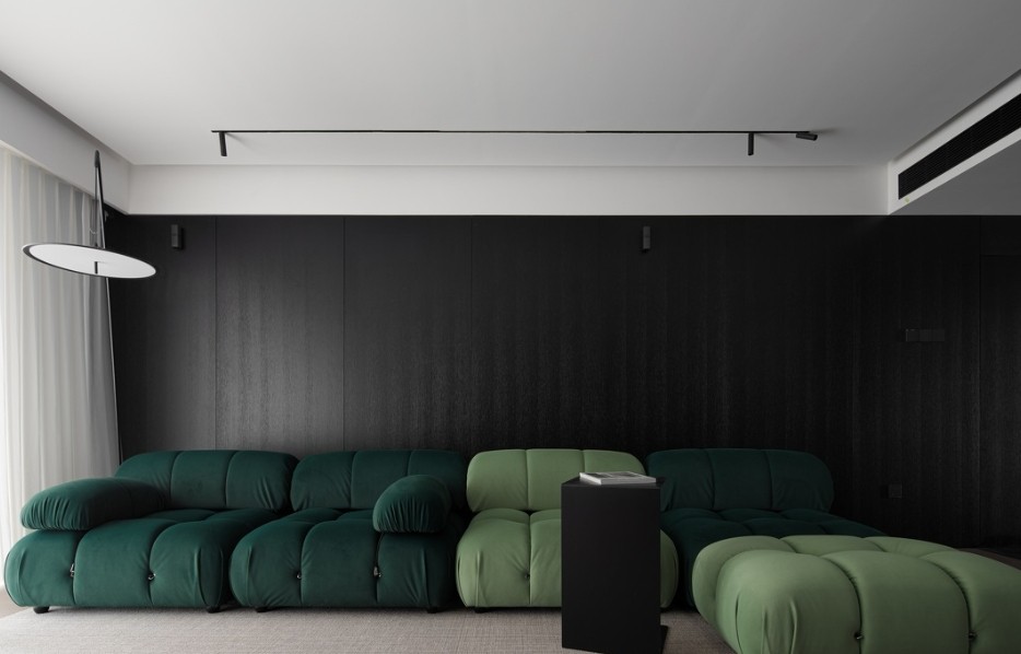 无主灯+隐藏灯带+落地灯,多种光源的搭配照射,让空间层次更加丰富,渲染空间的氛围及质感;客厅选取亮色系绿色软装沙发,模块沙发增加空间层次以及艺术感;绿色系的模块沙发为生活增添新鲜感,摒弃一成不变的颜色凸显个性。
