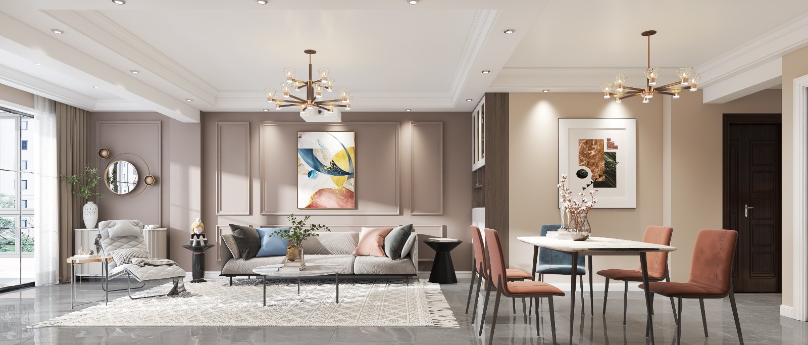 褐玫瑰红打底营造浪漫氛围,精致的软装以及跳色勾勒丰富空间层次,整个家优雅时尚。不同材质相互配合,有条不紊的诉说空间质感与格调。