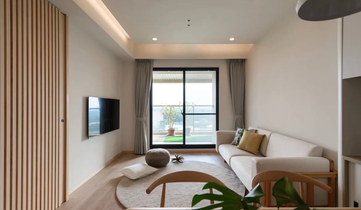 整体以简约清新为主,南北朝向,空问通透,白天采光充足,阳台纳入客厅空间,大面积现代感落地窗设计将阳光引入室内,变幻莫测的光线漫反射到墙面,似水潺潺,缓缓流动,温暖叉浪漫;搭配奶白色柔软沙发与日式清新地毯做点缀,营造纯粹、放松的生活氛围。