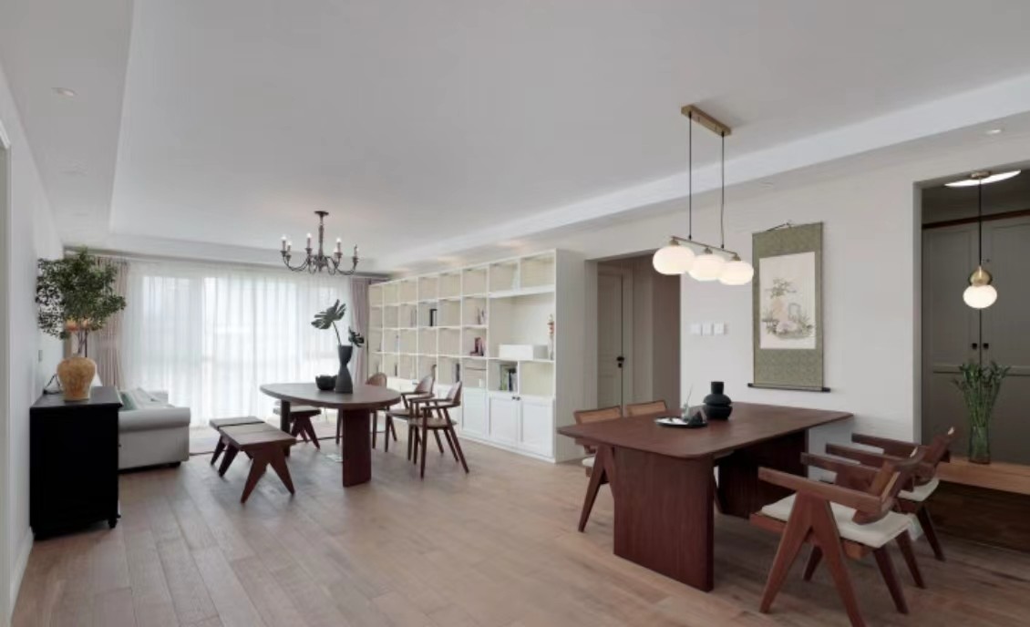 去客厅化的开放式大横厅,同一空问下,由家人自由选择学习办公还是休闲。电视背景墙被满墙书柜代替,有藏有露满足不同收纳需求。