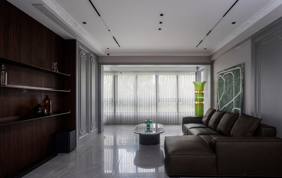 这是一例以法式轻奢为格调的家居空间,建筑总面积155㎡。屋主两人都希望家中可以浪漫一点、品质感强一点,空间以黑白灰为主。以低饱和度的灰色系大面积铺陈,辅之以绿色系做局部提亮,搭配精致软装,造就永不过时的法式浪漫情调。