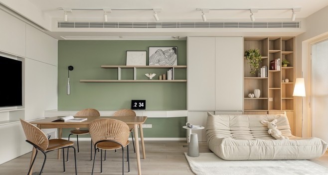 改造后的客餐厅布局,有着多功能化的转换。由于客厅没有主电视墙的位置,因此设计师将观影区移步至餐厅区域,平常两人可以一边吃饭一边电视