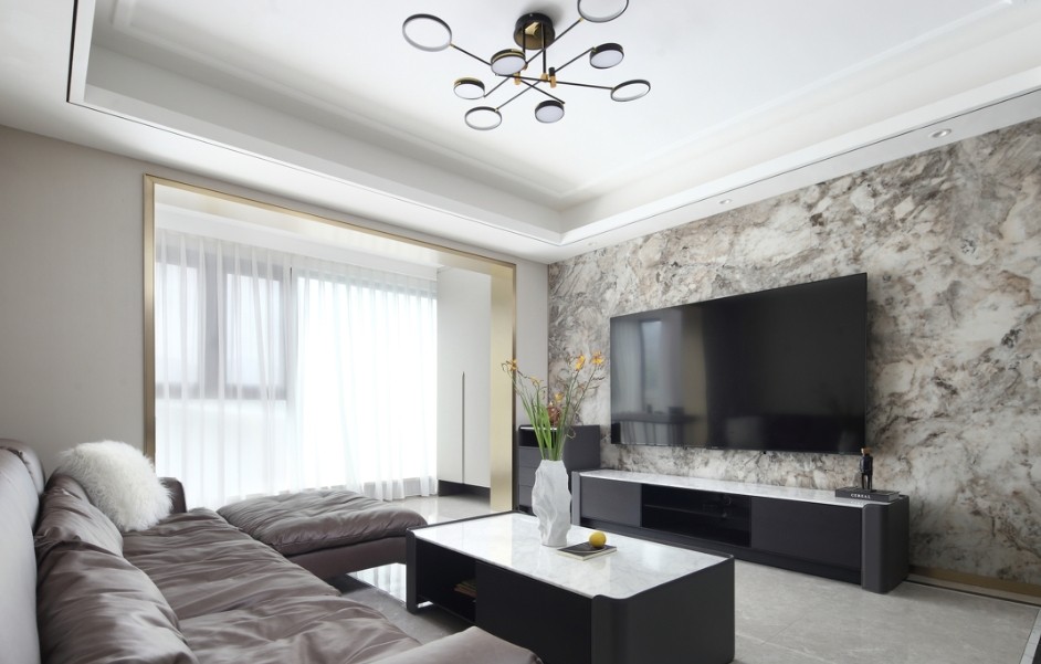 客厅空间简洁明丽,设计师将原户型自带的电视墙更换为拥有自然流动纹理的岩板,以动态韵律勾勒独特质感,与整体空间相协调。