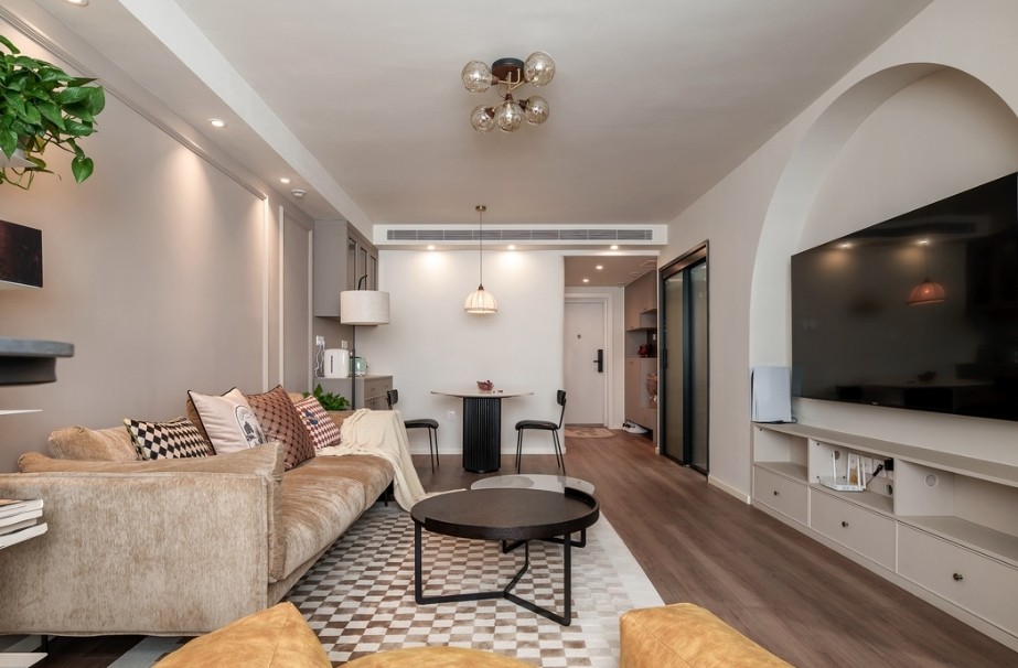 电视背景墙同样采用嵌入式+拱形设计,艺术感十足。