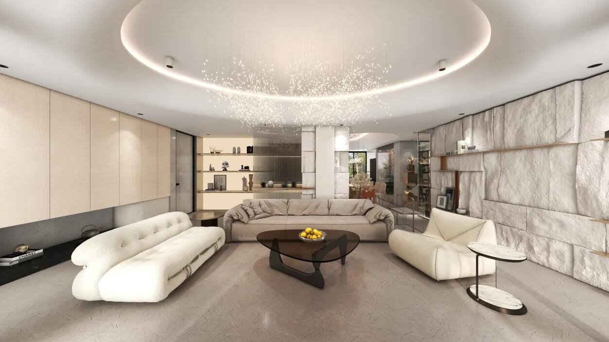 弧形大吊灯搭配米灰色家具,提升整体空间氛围感。