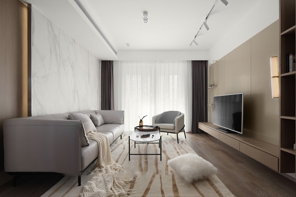 温润的自然光透过纱帘洒满客厅,使空间呈现出视觉上的美感和统一,整体通透明亮,简单大气