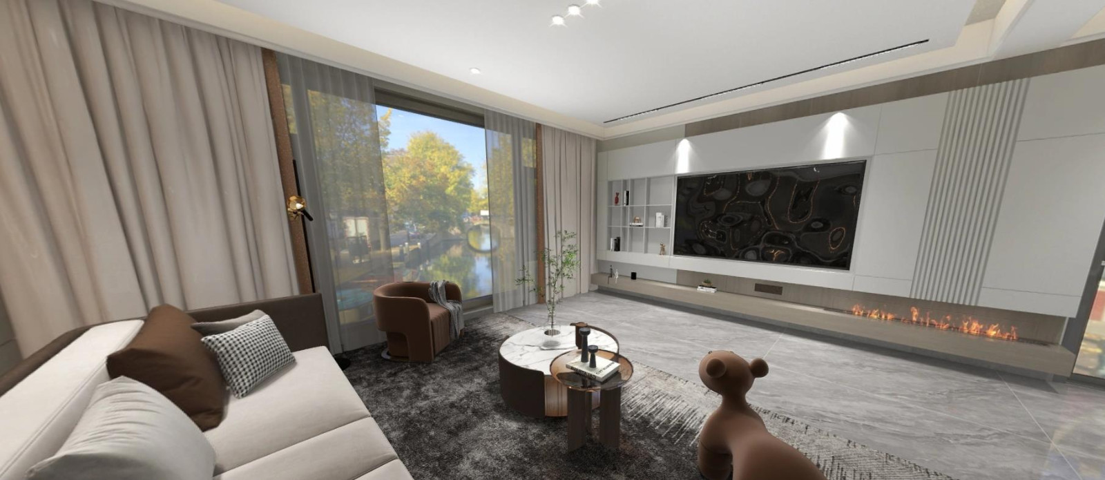 整个设计风格偏现代风,给人视觉上很宽阔很宽敞,吊顶采用悬吊式设计,不仅不影响层高,同时将整个空间提升了一个档次,深色地毯搭配灰色磨砂地砖,不仅耐看时尚,同时还方便清洁,如果家里有孩子的,可以选择灰色瓷砖,电视背景墙采用石材,同时还做了能够收纳的置物架,方便客厅的物品收纳