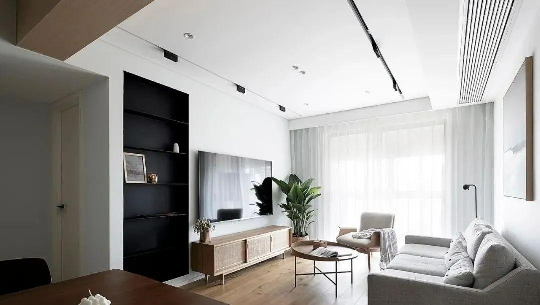 客厅整体以白色为主,木质家具在纯白的基础上加以点缀,没有太多的色调拼接,用最干净的清淡色彩来表现出一种极简的自然主义。