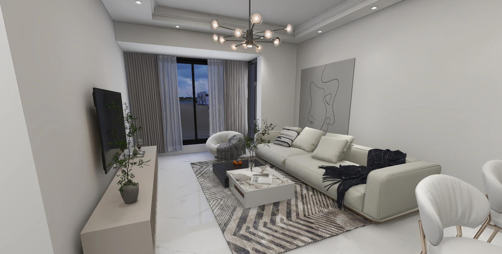 1.整个设计主打的就是简约,所以电视背景墙采用最耐看的白色乳胶漆通刷,地板采用白色亮面瓷砖,色彩与风格相匹配 2.双眼皮的吊顶设计搭配上独特造型的主灯,时尚***的氛围感顺势而来 3.把阳台包上和客厅融为一体,增加了空间的空气流动性
