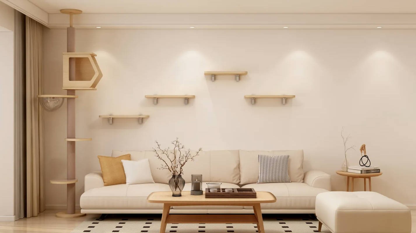 客厅放置了悬挂在墙面的小台面,丰富了墙面同时也不会影响空间还能有储物的功能。
