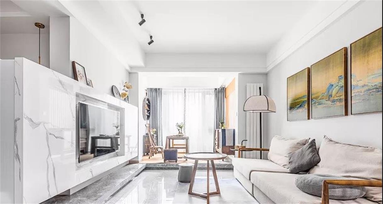 客厅的光线非常的充足,天花板和墙面全部留白,客厅地面和阳台做了台阶,很有层次感。左侧的半截电视墙用自带的大理石花纹做装饰,电视内嵌,看上去干净,光泽度高,半截墙面上还可以放不少摆件,比较实用。