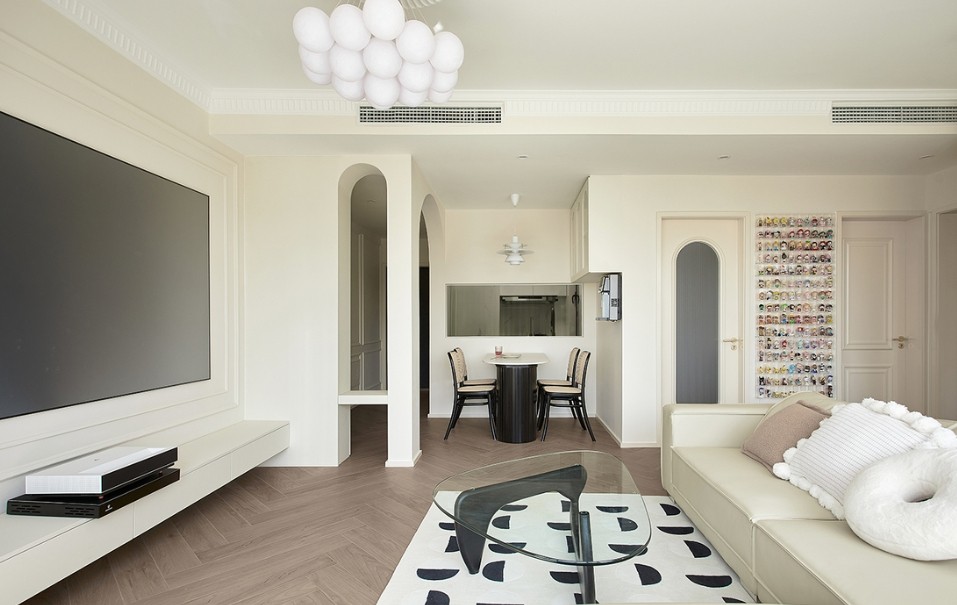 电视墙用双层石膏线进行了勾勒,这么看起来投影幕显得更大。球形的客厅吊灯搭配古典造型的石膏灯盘,有一种现代与复古的冲撞感,得益于都是浅色,并不突兀。