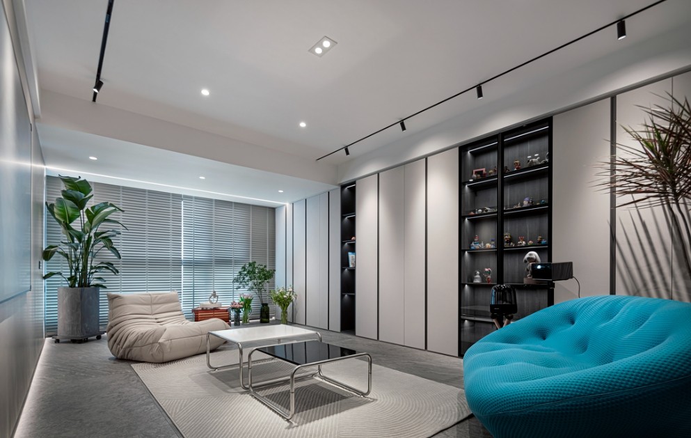 开灯后的效果,灯光设计主要是以点光源为主,吊顶中间用射灯+斗胆灯做主光源,两边的轨道射灯做辅助灯光,墙面采用LED隐藏灯光踢脚线。