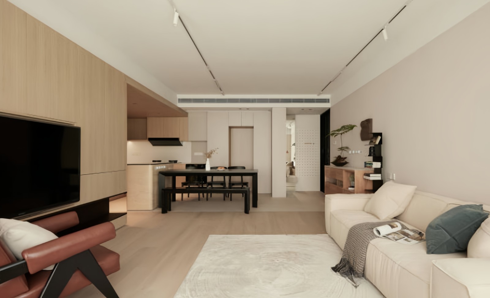 电视背景墙完美贴合墙体结构,采用墙板+储物柜结合的形式,木饰面板延伸至开放式厨房,实现区域内用材的统一,无把手柜实现隐形收纳,强调空间的整体性。