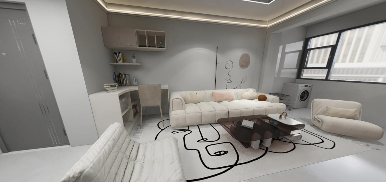 1.整体色调趋向于灰色,顶部则采用双眼皮的吊顶形式,再加上灯带的加持,使得整个空间看起来既明亮又*** 2.墙壁采用灰色的乳胶漆通刷,使得整个空间色彩统一,不会有突兀感,软装则选择白色的豆腐沙发,灰白两色调间的碰撞,顺利凸显出现代风格的特点,让整个空间看起来舒服、***