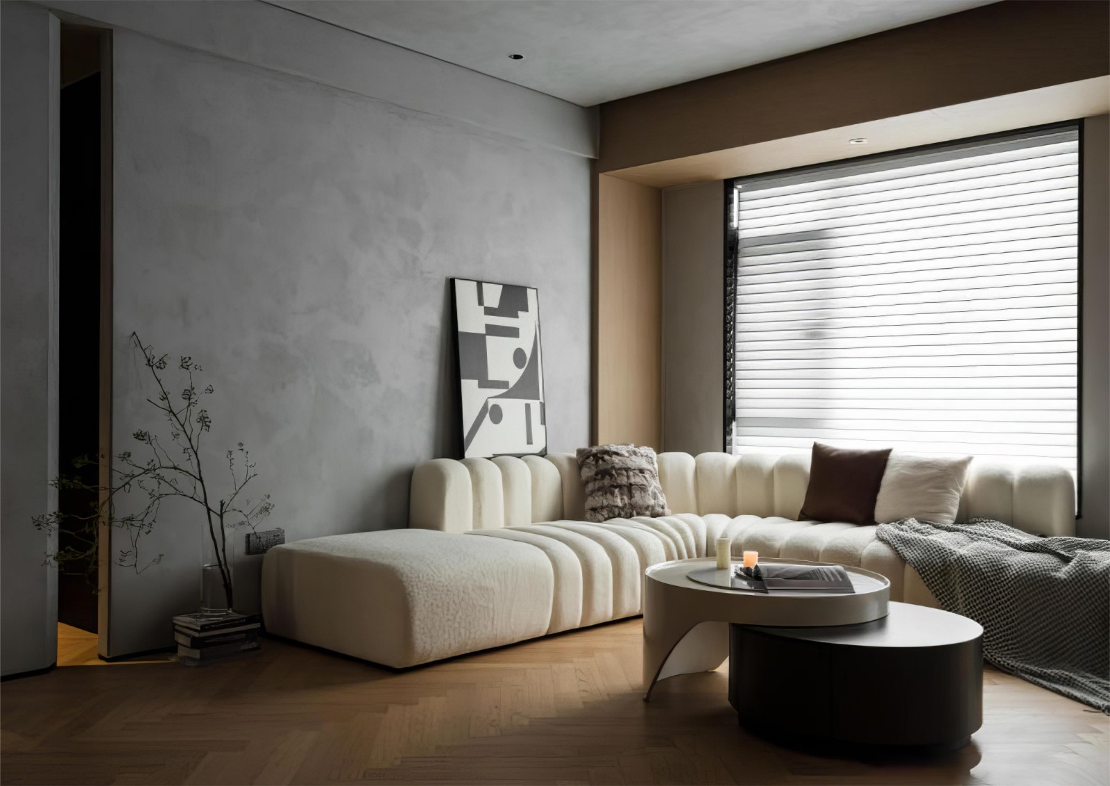 墙面用上采用的是水泥灰的艺术漆,再搭配木饰面与局部黑色的点缀,空间瞬间高冷起来! 沙发后的百叶窗,引光入室,肆意流动。隔热遮阳,柔韧性和阻挡紫外线的效果也不错。
