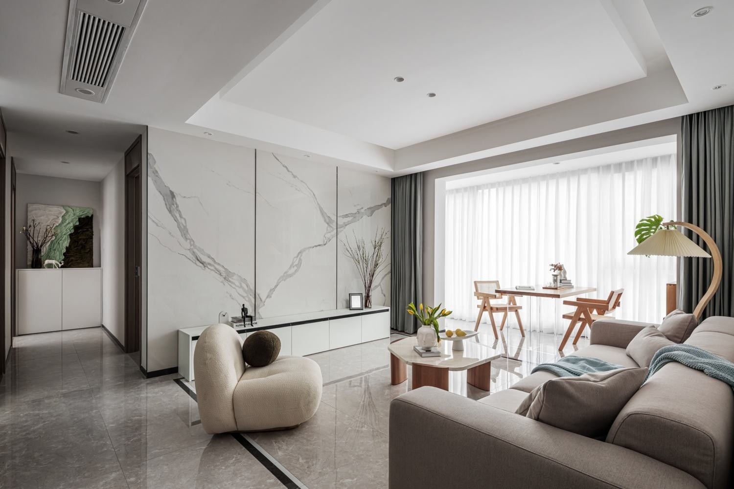 客厅摒弃了繁杂的装饰,简约的灰色布艺沙发搭配石材与木质组合的茶几,各类温和的材料毫无违和感,在空间中散发着自然的气息。S形落地灯牵引着视觉重心,为空间增添了柔美的艺术氛围。