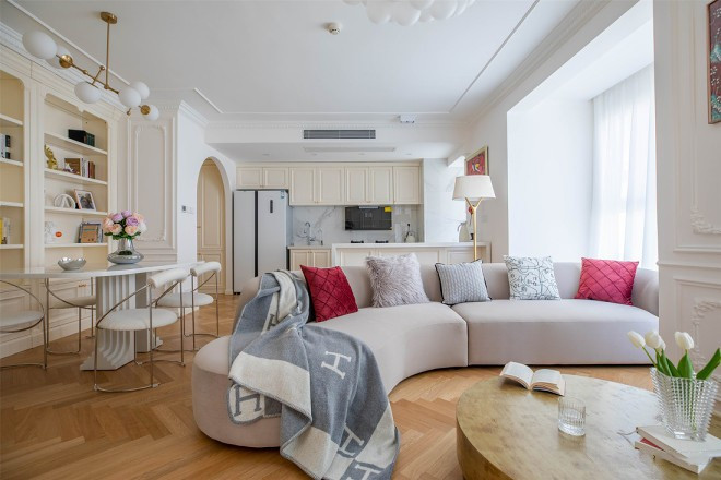 合形态沙发呼应空间中的柔和弧线,造就圆融温馨的客厅氛围。低饱和度灰调的选色,让沙发在奶油调空间中自成焦点。
