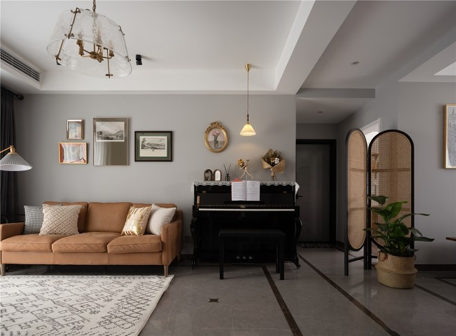 沙发边留一块区域放置业主心爱的钢琴,使空间内容丰富起来,过道的尽头是卫生间,由于未改动原户型,厕所门对着大门还是很尴尬的,所以设计师选了个韵味十足且使用非常灵活的折叠屏风来缓解这个尴尬。