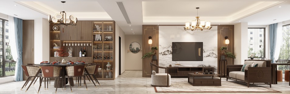 甲方钟情于新中式风格,将中式与现代风格融入,由于是退休养老住宅,所以在灯光及配色上以暖色为主,增加空间的温馨感。