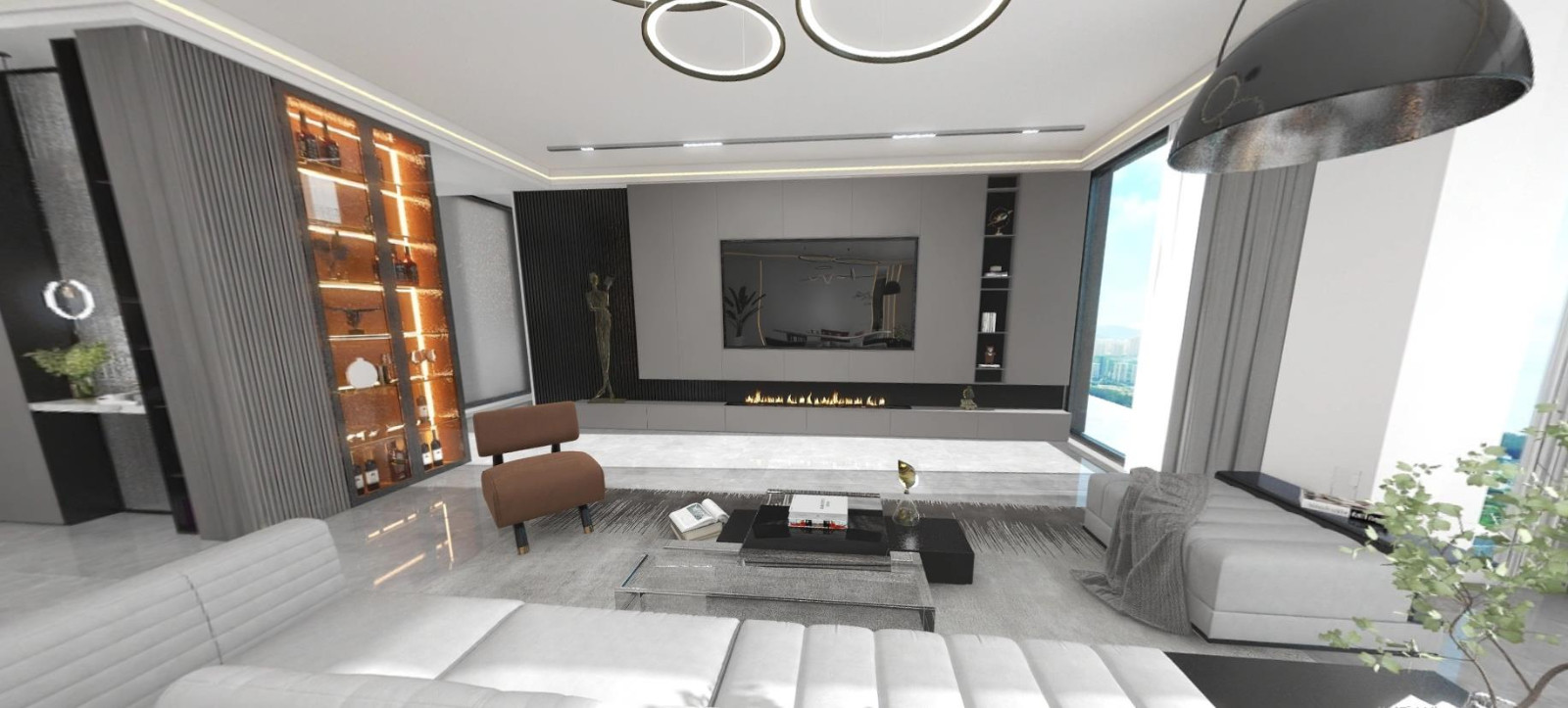 1.客厅采用了"双眼皮吊顶+嵌入式灯带"搭配独特造型灯设计,不会让空间压抑以及光照不足,反而这样的吊顶空间一体感很强,简约大气 2.电视背景墙则采用岩板和木栅栏的结合设计,提升整个空间档次,旁边收纳透明收纳柜的设计,方便日常物品的分类及摆放,柜体内部设有感应灯带,暖调灯光搭配深色柜体,整个***感顺势提升